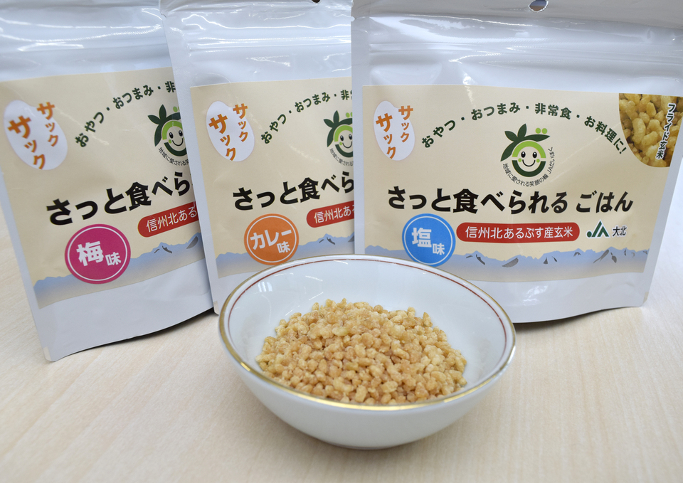 概要:大北産玄米を使用したフライドライスです。揚げてあるためとてもカリカリの食感です。おやつとして食べるほか、賞味期限も5年と長期間の保存がきくため、非常食としても活用できます。