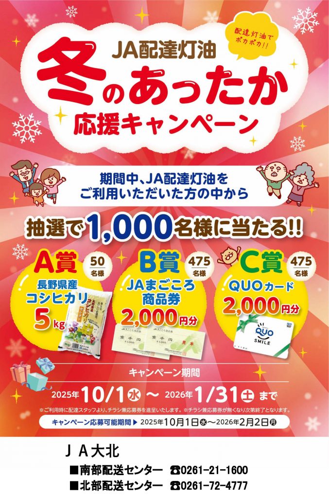 JA大北の各配送センターでは、10月1日よりJA配達灯油のご利用で豪華景品が当たるキャンペーンが始まりました!