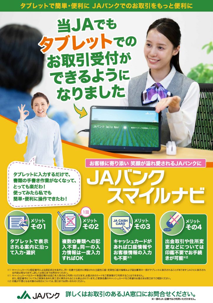 JAバンクでのお取引をもっと便利にご利用いただけますよう、当JAでもタブレットを利用したお取引受付(JAバンク スマイルナビ)ができるようになりました。