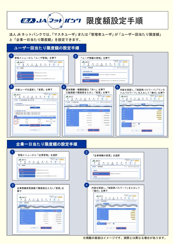 また、万一の場合に被害を最小限に抑えるために、法人JAネットバンクの「振込・振替」、「税金・各種料金の払込み」のご利用限度額を必要範囲内の適切な金額に見直しをしていただきますようお願いいたします。
