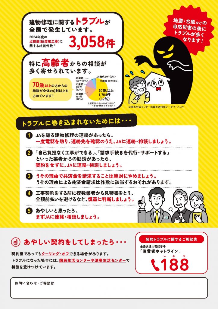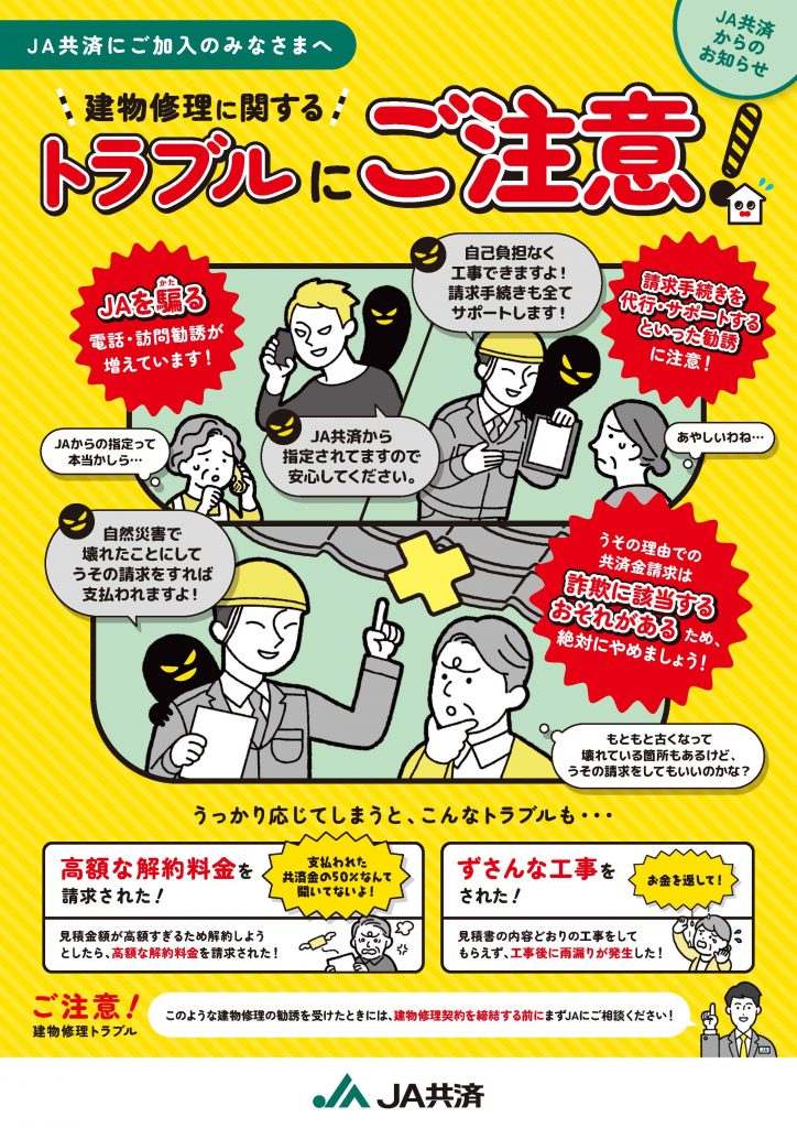 【注意喚起】「共済サポートセンター」を騙った建物被害無料診断事案の発生について